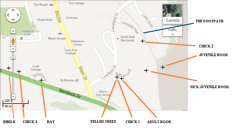 A crow chick around two weeks old was found on the pavement by the main road metres away from where a dead rat was seen two days earlier.